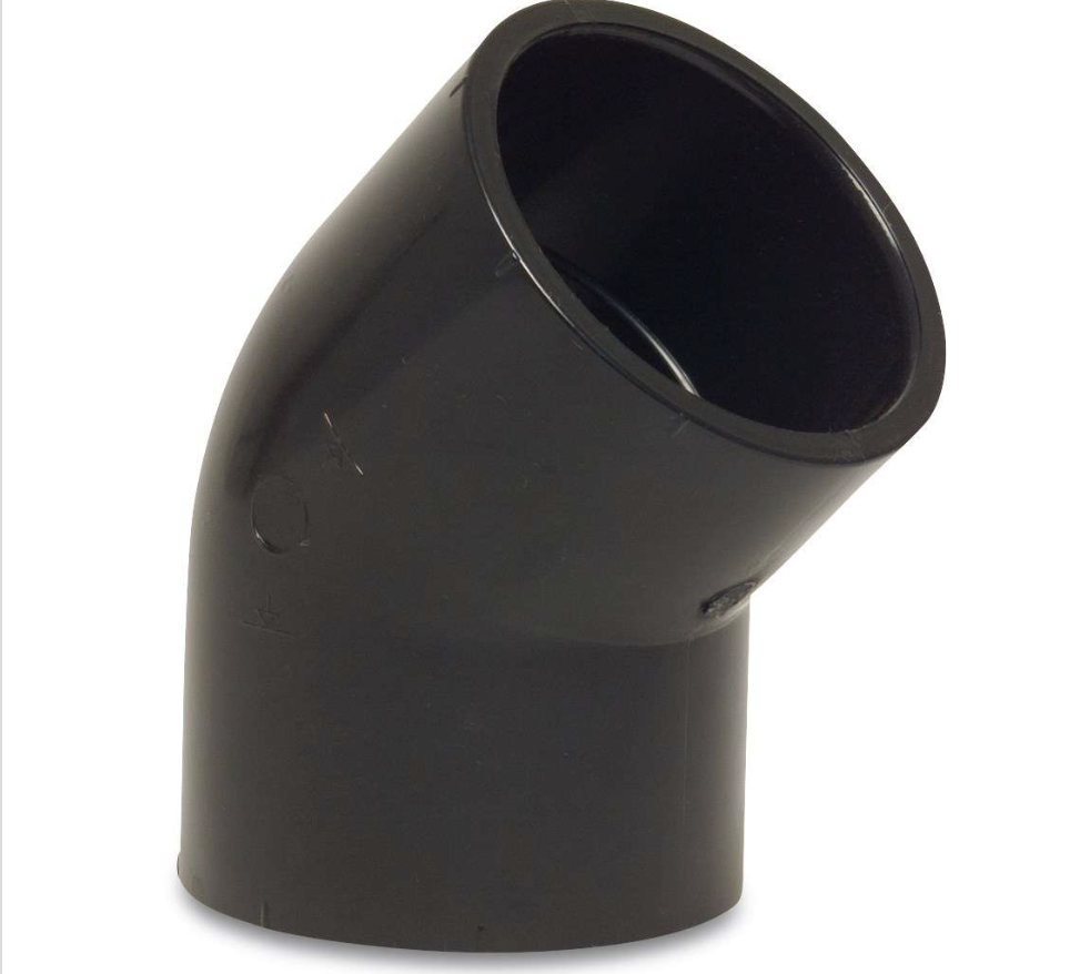 Our PVC Elbow 45° made out of PVC-U. It has socket x glue connection and works up to a maximum of 16 bar pressure.
